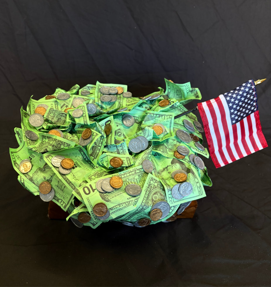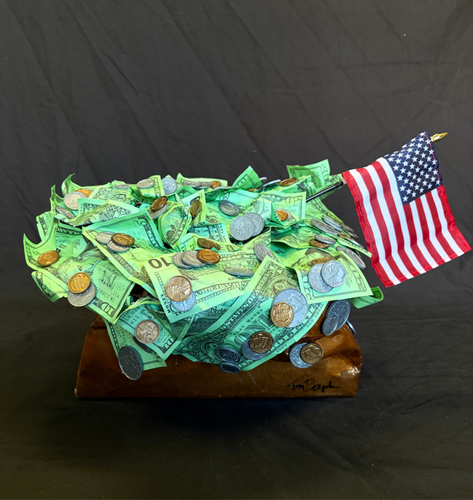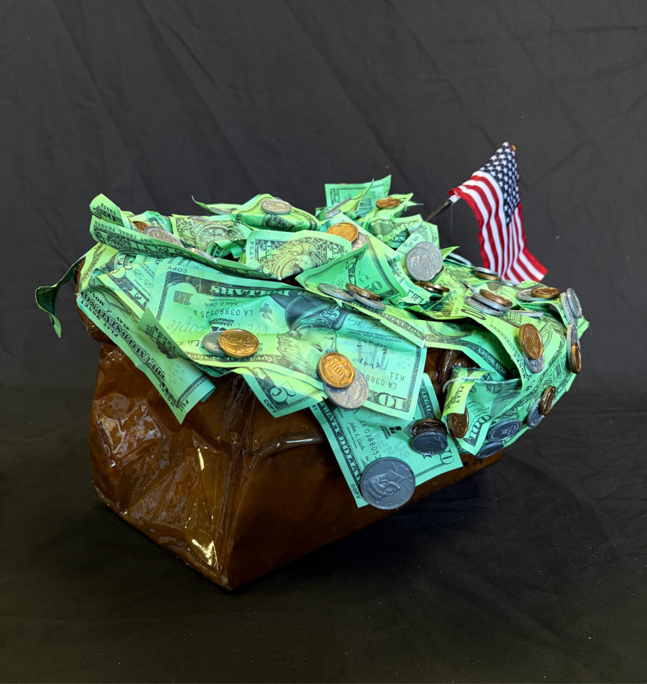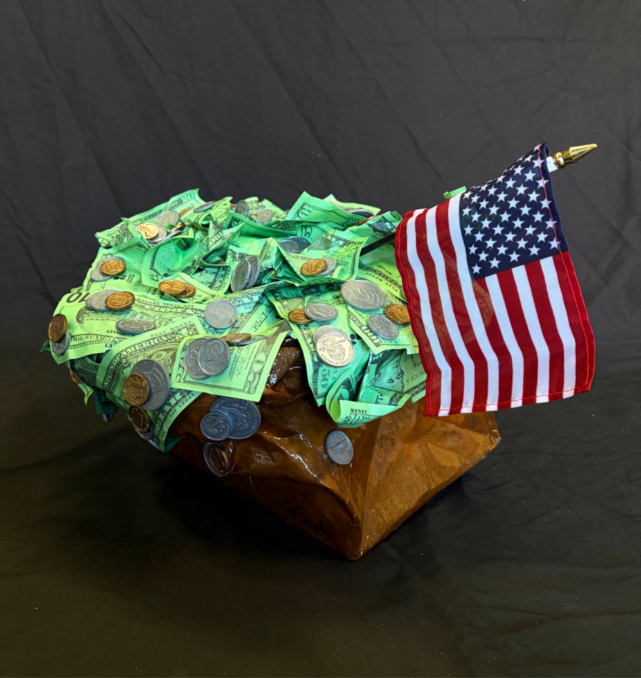 “Bag O’ Money” is painted with acrylic paint, coated in resin