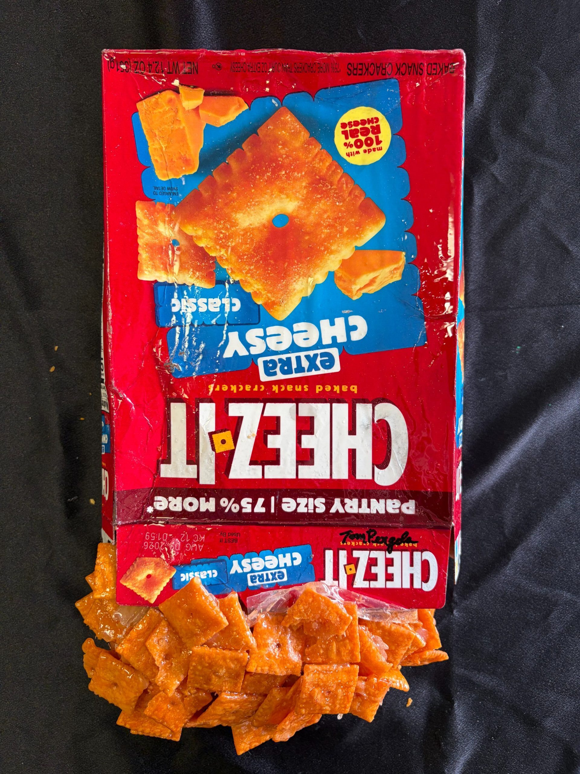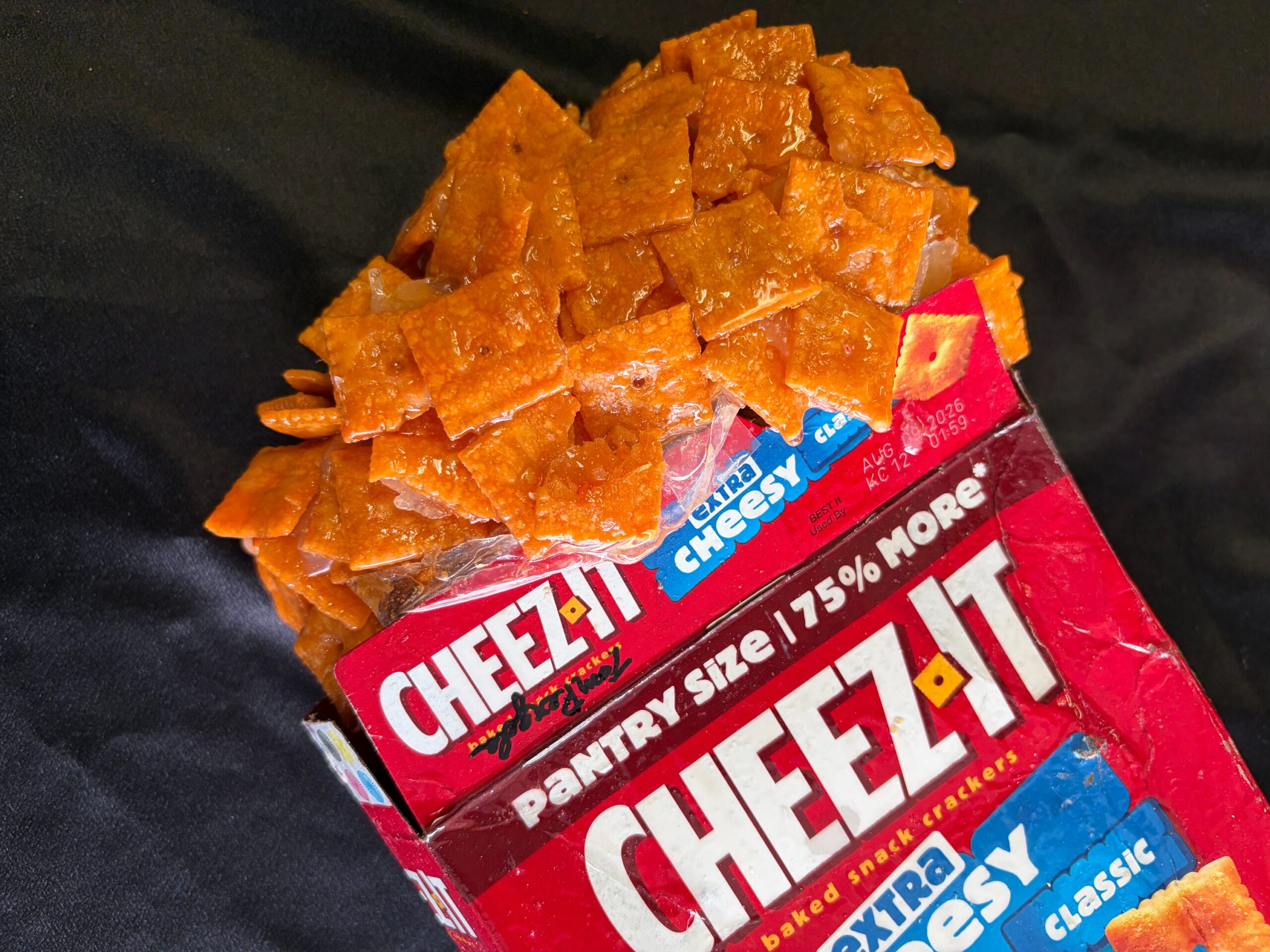 “Cheez-It ” is painted with acrylic paint, coated in resin