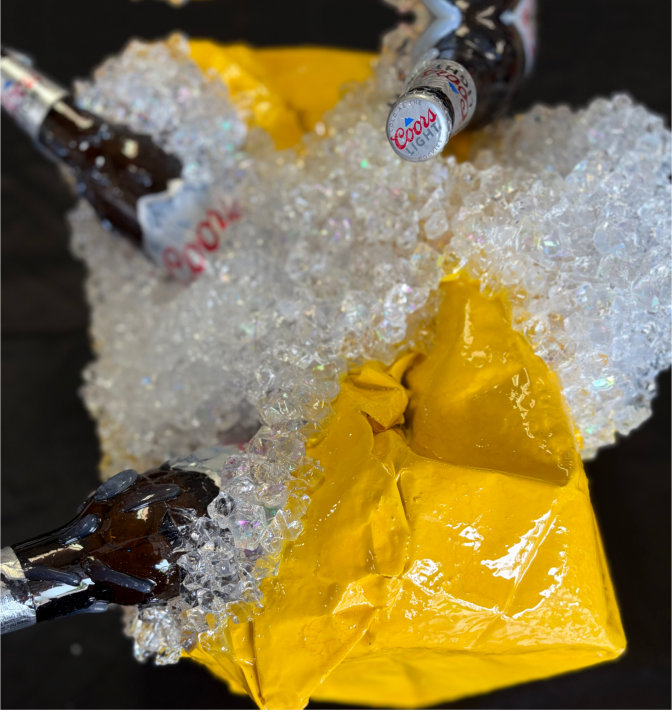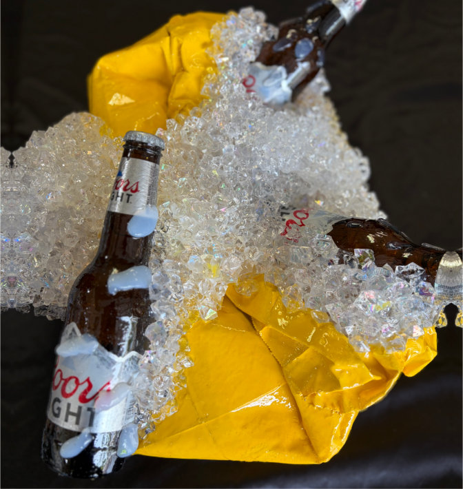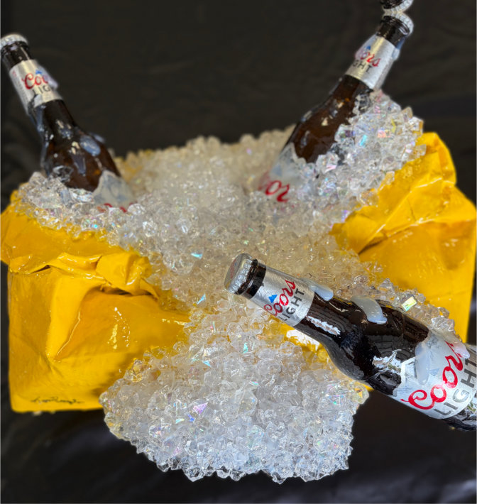 “Ice Cold Beer” is painted with acrylic paint, coated in resin