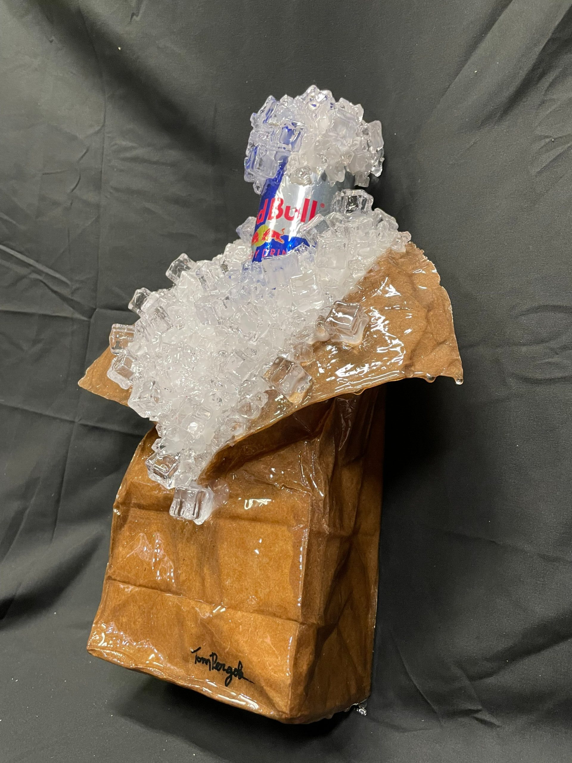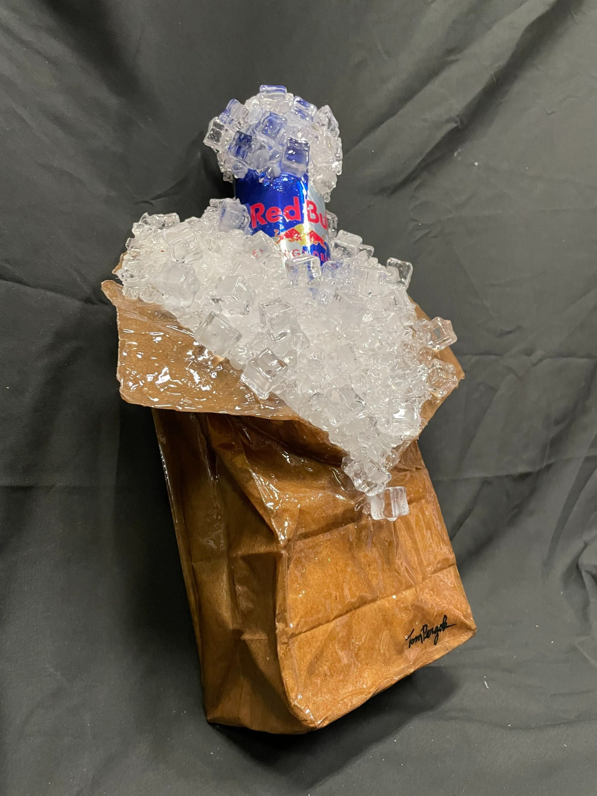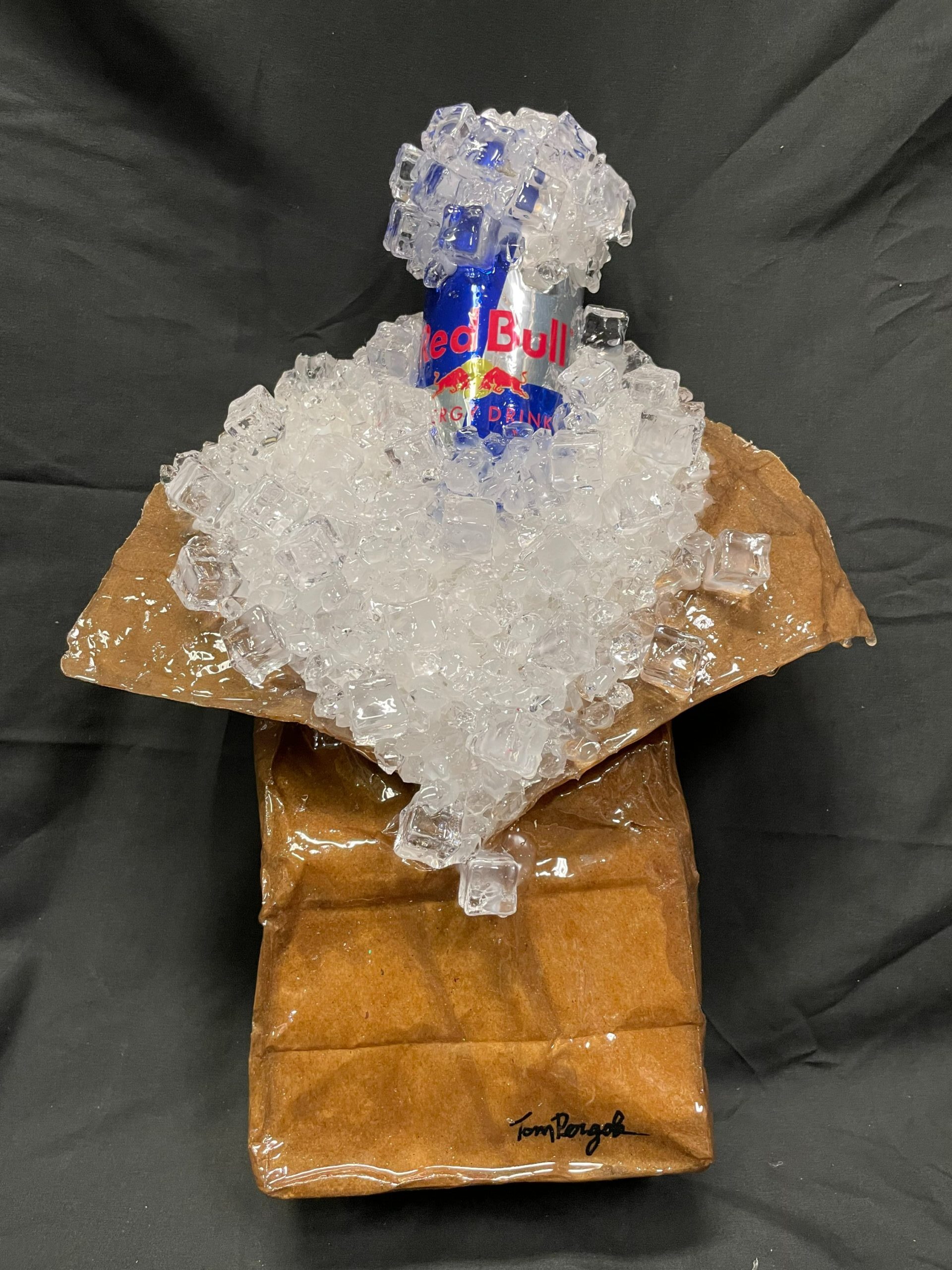 “Red Bull On Ice” is Tom Pergola’s provocative twist on consumption culture—where a familiar energy drink becomes a sculptural study in contrast, motion, and chill. Red Bull cans are sliced, layered, and reimagined among icy pallets, frozen forms, and industrial textures. The entire composition is sealed with glossy resin, offering a striking sculptural depth.