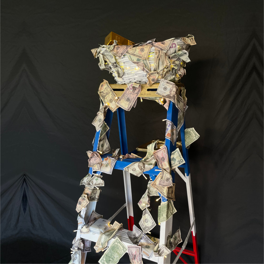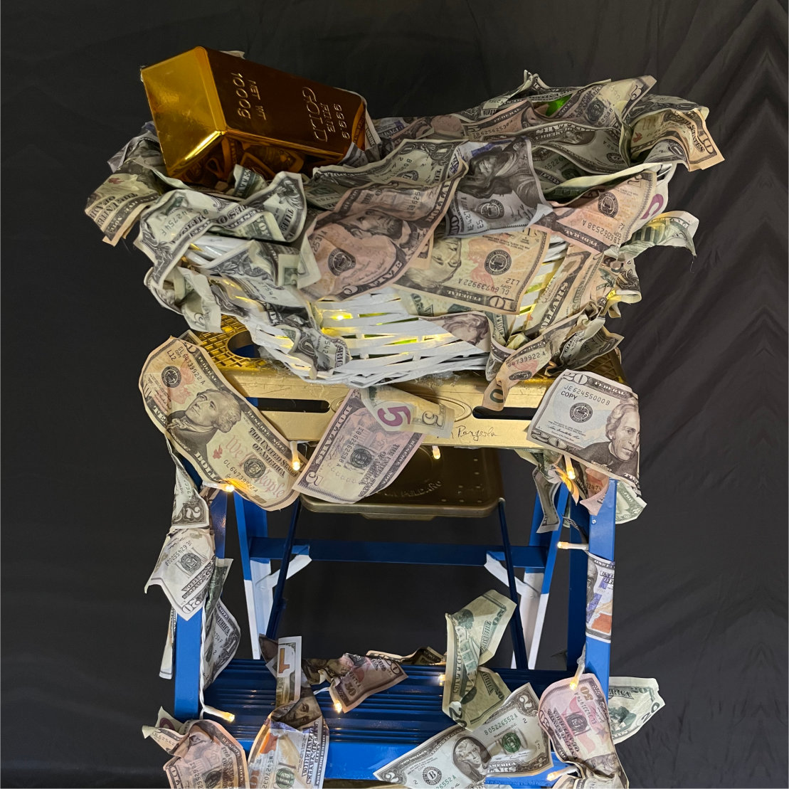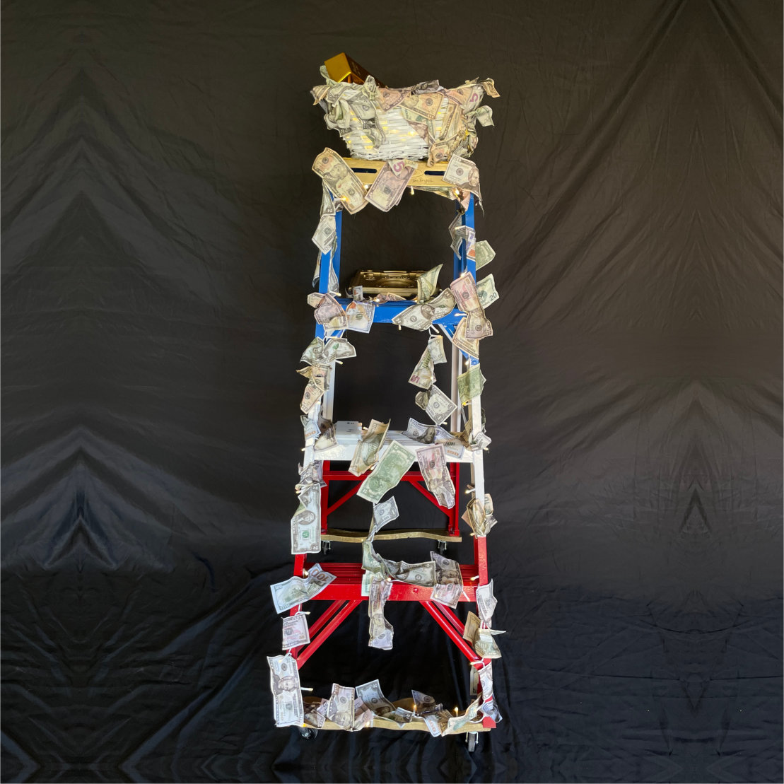 Rendered in Pergola’s signature high-contrast palette, the ladder emerges from a layered backdrop of consumer graphics, fragmented text, and cultural references. Each rung tells a story—some are solid and gilded, others are cracked or morph into unexpected objects, questioning the very nature of the climb. The composition is both playful and profound, inviting viewers to contemplate their own journey amidst a sea of modern noise.