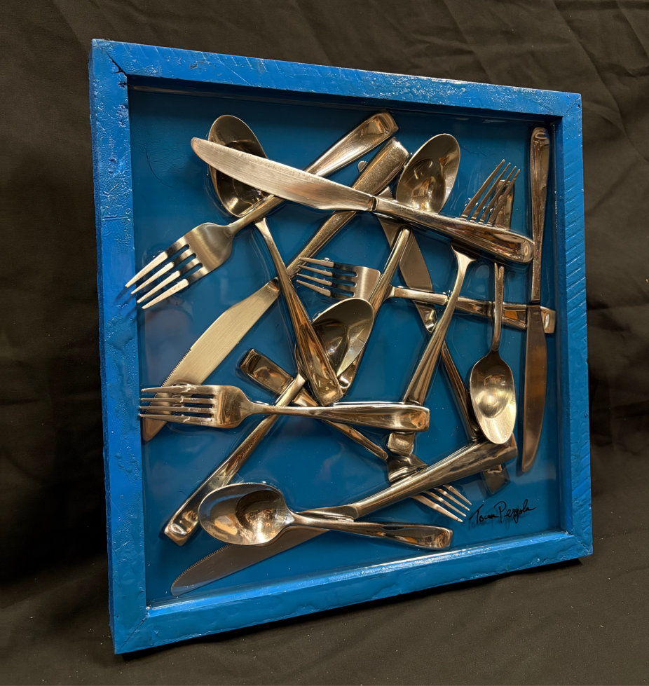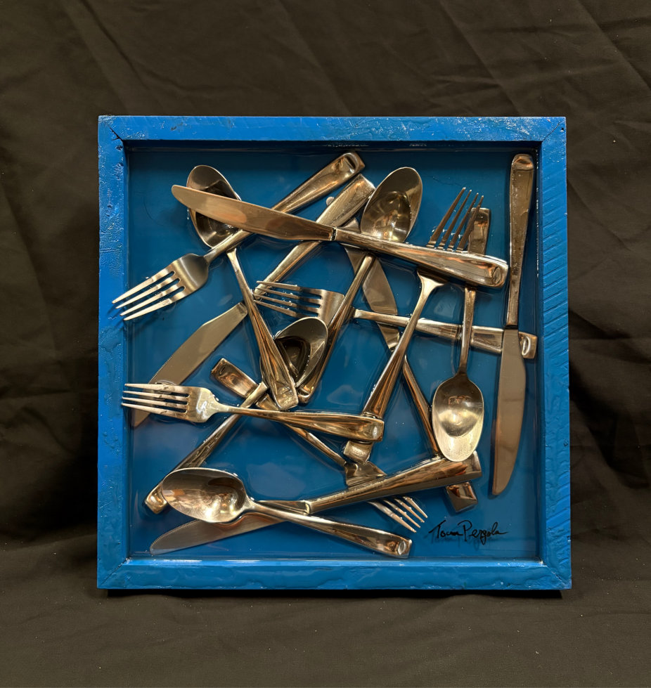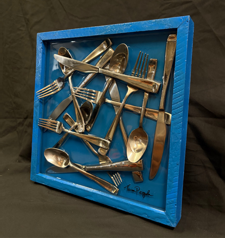 “Utensils” is painted with acrylic paint, coated in resin
