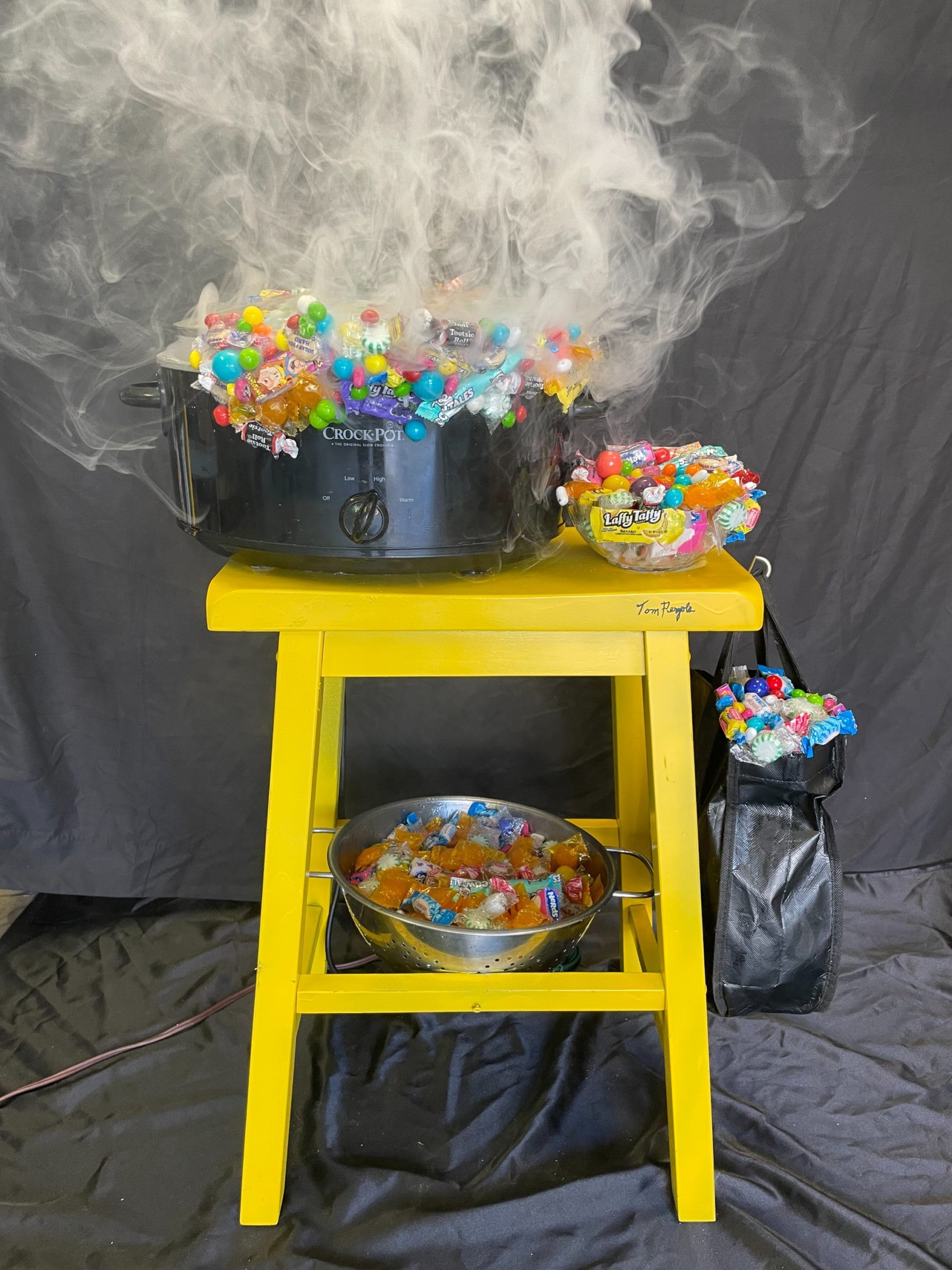You Are What You Eat by Tom Pergola Fine Art is a vibrant, conceptual sculpture that fuses humor and social commentary into one unforgettable visual experience. Measuring 2′9″ × 1′8″ × 1′2″, this piece transforms everyday objects — a slow cooker overflowing with colorful candies and mist — into a dynamic metaphor for indulgence, consumer culture, and modern life’s appetites.